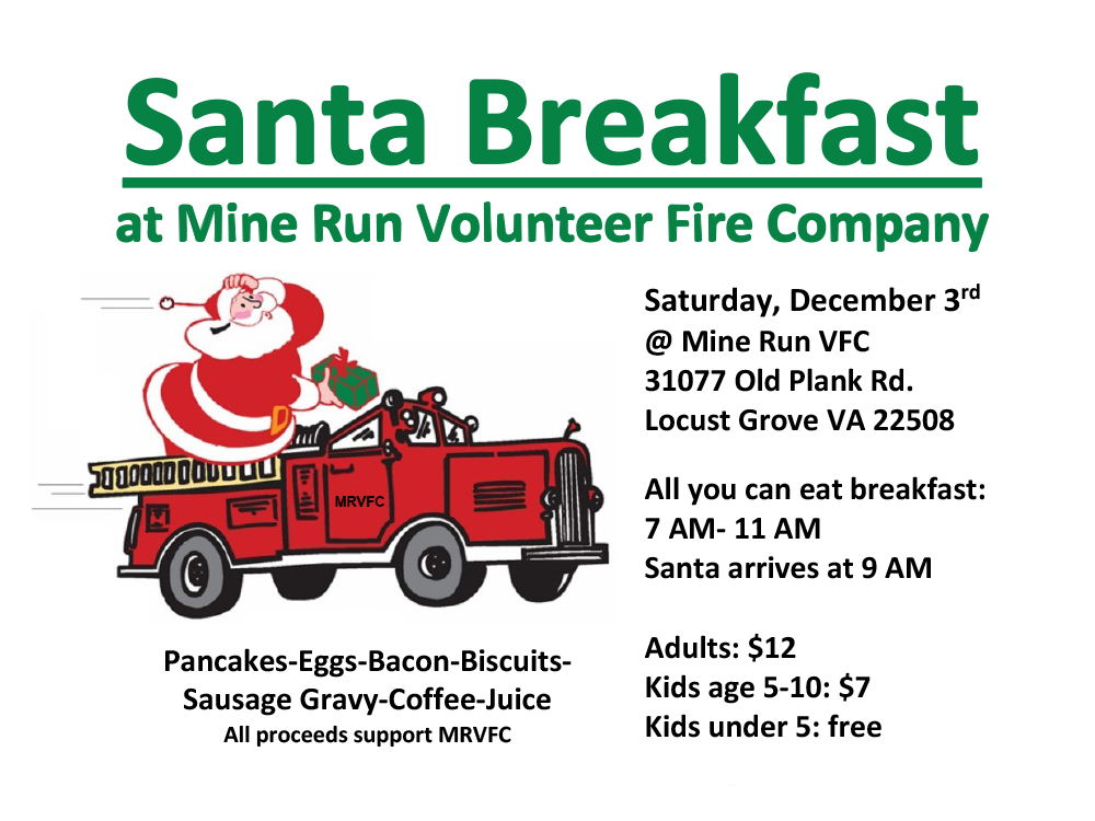 MINE RUN VFC’S Santa Run DEC 20TH This year the Santa Run will take place on December 20th. Santa will visit the following locations and will depart the Mine Run Fire Department at 6pm. UNIONVILLE ELEMENTARY 6:15–6:30PM E.V. BAKERS STORE @ 4066 ZACHARY TAYLOR HWY. 6:40–6:50PM LAFAYETTE STATION @ 26322 CONSTITUTION HWY. 7:00–7:10PM LOCUST GROVE […]
